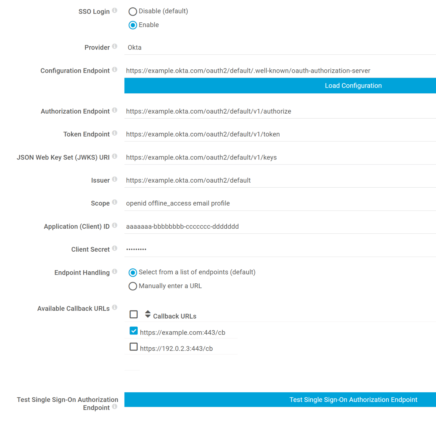 Note: If this does not work, enter the values manually as follows. Use your Okta domain and your authorization server ID.- Authorization Endpoint: https://<yourOktaDomain>/oauth2/<authorizationServerId>/v1/authorize