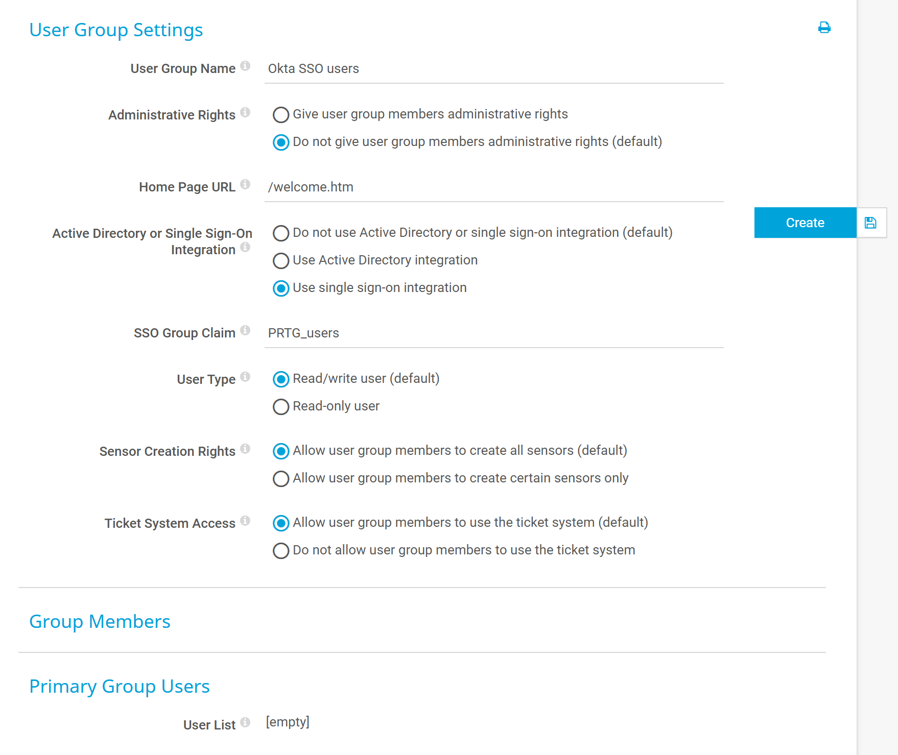 - A user group in PRTG can only have one SSO Group Claim. This means that if you want to use more Okta groups than one, you need to create more user groups in PRTG in step 3, and assign to each one the respective Okta group as the SSO Group Claim.