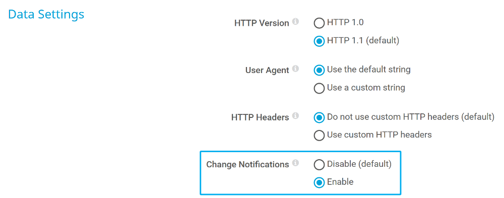 - Find the Change Notifications setting and enable it. The section name of the setting varies by sensor. Example: Change Notifications setting of the HTTP Advanced sensor.