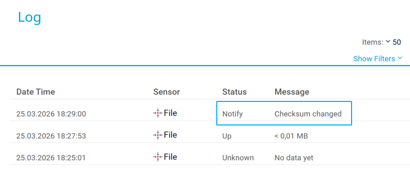 Change triggers are usually used in tandem with change notifications. A change notification in PRTG is a log entry in the sensor or device log with the status Notify.