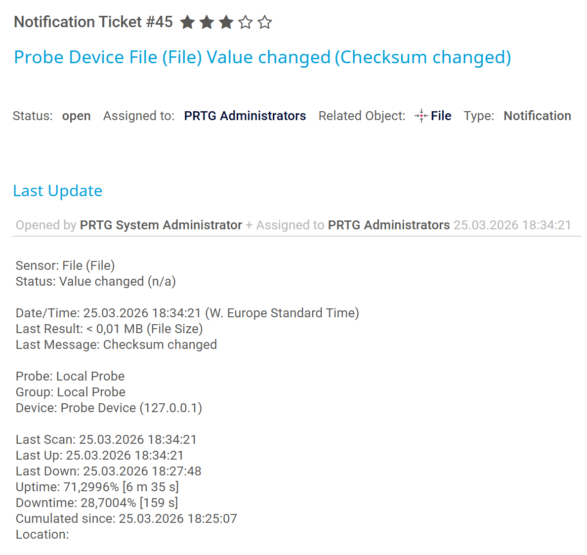 Now, when the trigger condition is met, PRTG also initiates the notification that you define in the change trigger. For example, if you choose to receive a ticket, a notification ticket appears on the Tickets tab when there is a change.